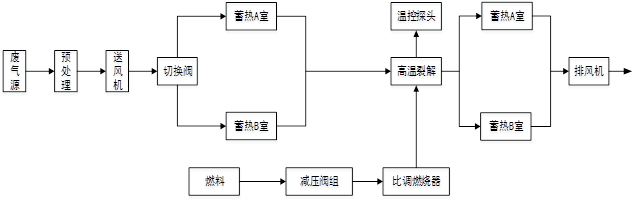 蓄熱催化爐主要由內膽、外殼、催化劑、蓄熱體、溫度、壓力傳感器、旋轉換向閥和防爆口等組成。